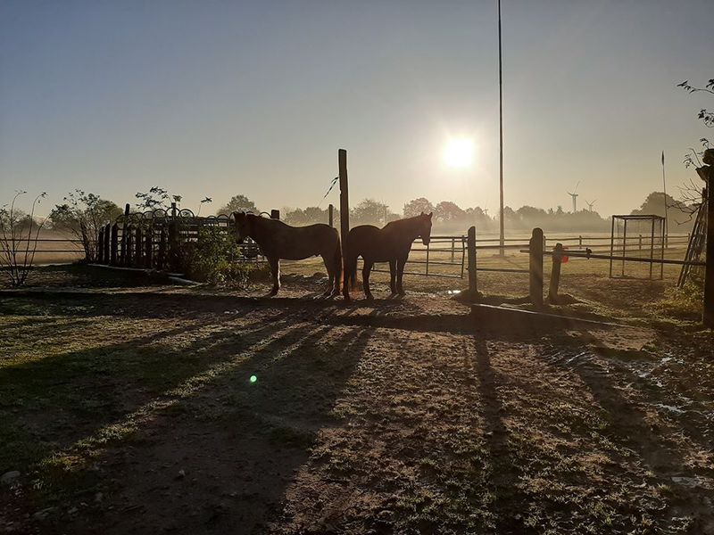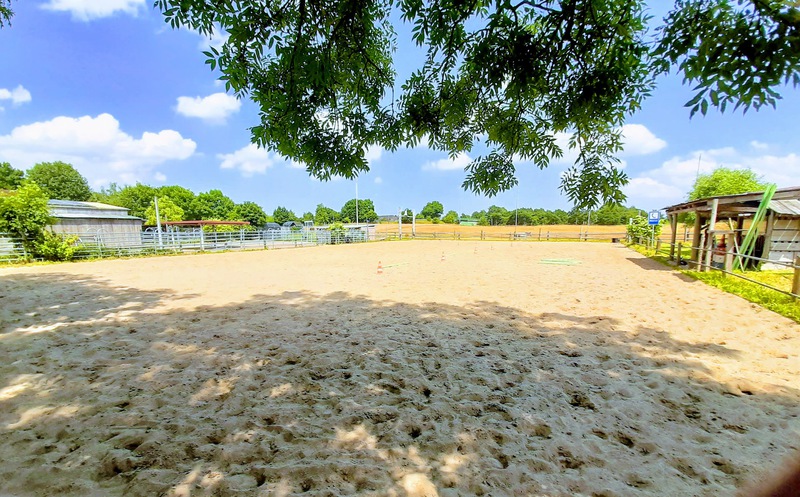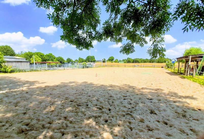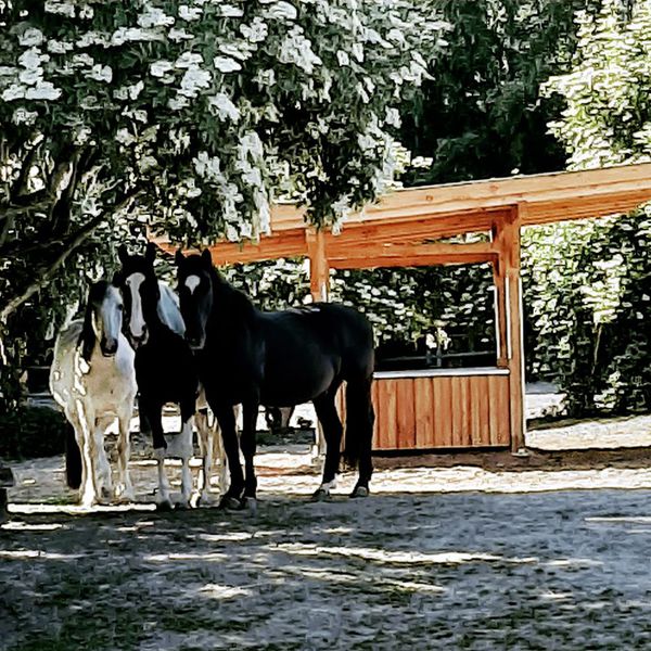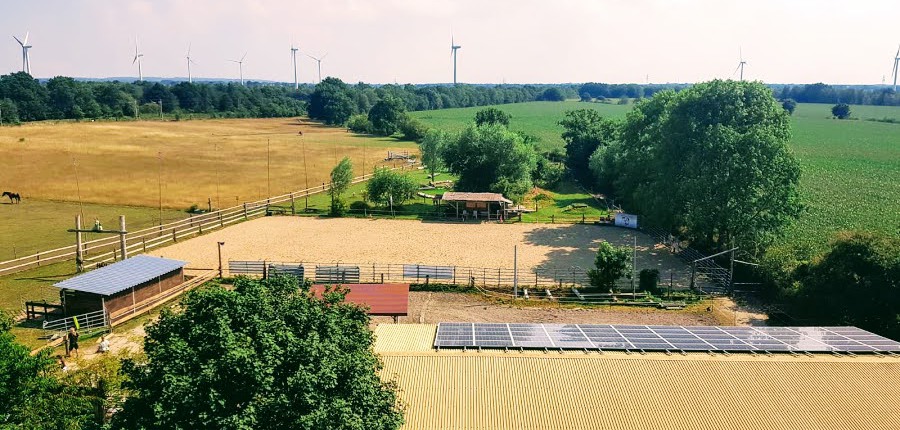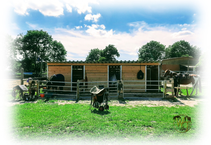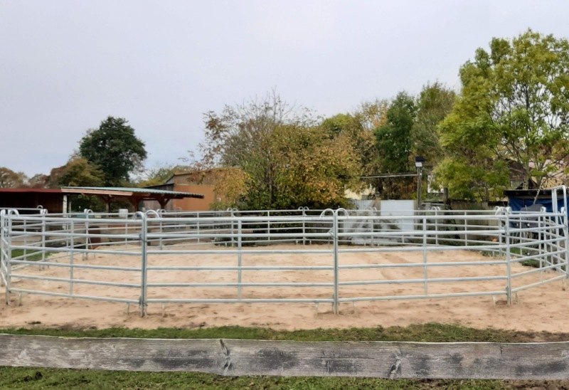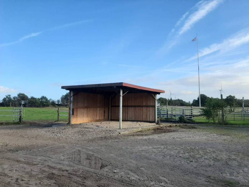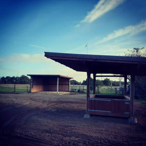 einen Pensionsstall mit zwei Offenställen mit großzügigen Paddocks, nach Geschlechtern getrennt. Die Offenställe verfügen jeweils über integrierte Krankenboxen mit