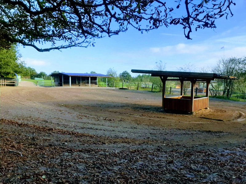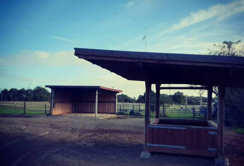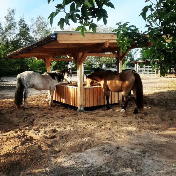 kleinen Paddocks, Überdachte Futterraufen und eingestreute Liegeflächen.
